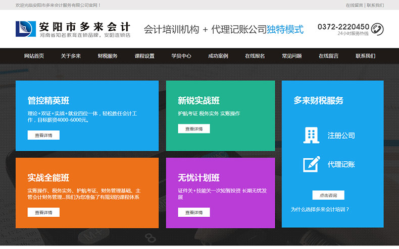 安陽市多來會計服務(wù)有限公司是由河南多來教育集團(tuán)和河南因心財務(wù)之家領(lǐng)導(dǎo)下首創(chuàng)一站式會計培訓(xùn)、企業(yè)注冊、代理記賬、商標(biāo)注冊、品牌策劃營銷等于一體的多元化企業(yè)會計服務(wù)平臺。致力于為中小型企業(yè)服務(wù),資源整合,培訓(xùn)出會計人才,為中原崛起助力、打造河南具影響力的企業(yè)服務(wù)平臺。客戶表示設(shè)計較好,細(xì)節(jié)上很到位,今后會多與青峰網(wǎng)絡(luò)合作。